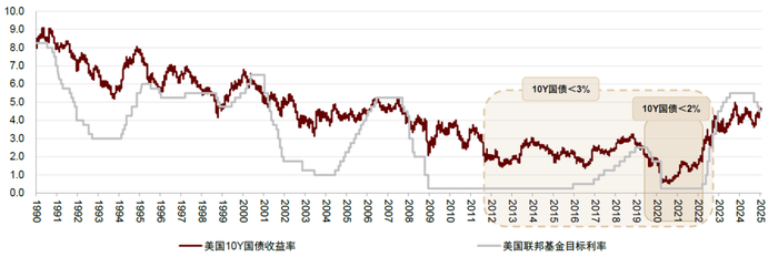 我们观察美国市场与政策利率走势,2009年以来,为应对经济危机压力,美国联邦基金目标利率降至0.25%,并维持至2015年末。时间来到2020年后,政策利率再次因疫情影响而回归0.25%点位。与此同时,美国10年期国债收益率也持续下探,2011年末首次行至2%以下,2020年则首次探及1%以下。
