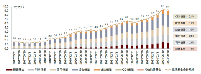 市场概况:2024年,市场行情助力下,纯债基金规模稳步抬升,2024年中达到阶段性峰值9.3万亿元,虽然三季度末股债“跷跷板”效应使得纯债产品迎来赎回压力,然而整体规模仍然在9万亿元以上,相较2023年同期扩容30%。从产品结构来看,中长期纯债型基金中的综合债基、利率债基和信用债基的规模占比仍然靠前,分别为32%、21%和21%,短债基金、被动债基和QDII债基也实现明显规模扩容,规模占比分别为14%、11%和0.4%。其中,被动债基在3Q24首次突破万亿元规模,QDII债基也同比扩容240%至380亿元以上。