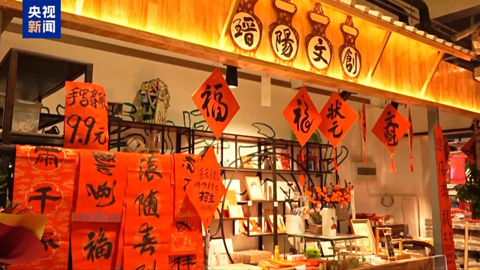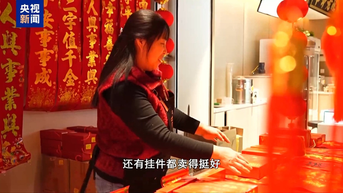 市集商户 柏仙萍:带蛇元素的对联、福字还有挂件都卖得挺好的。