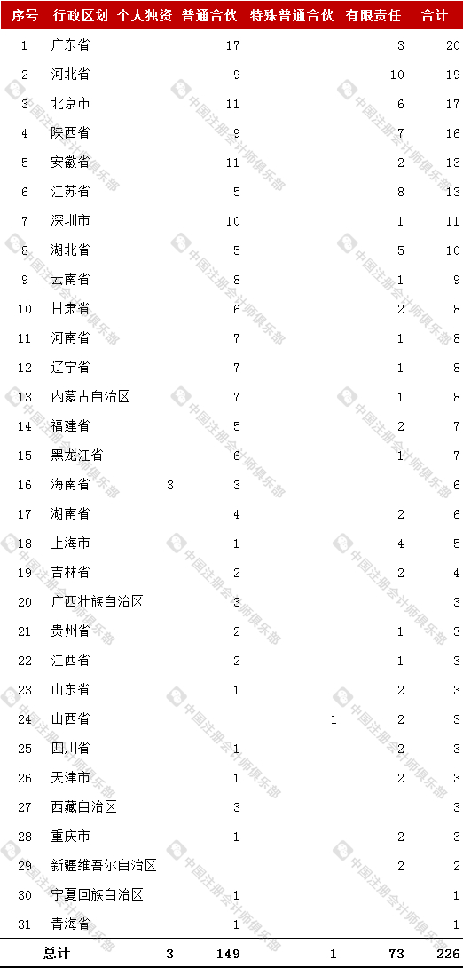 2024年度注销的会计师事务所共226家,按地域分析具体排名情况如下:
