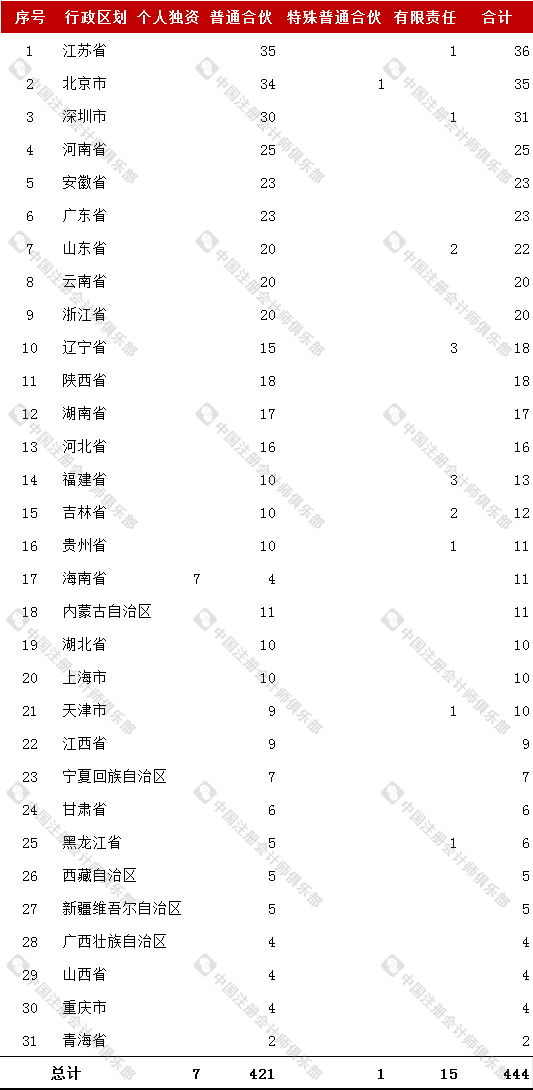 2024年度新设立的会计师事务所共444家,按地域分析具体排名情况如下: