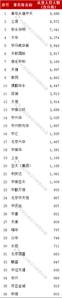 从业人数超过500人的会计师事务所共有36家。具体排名情况如下(注:财政部系统显示截至2024年12月31日,瑞华仍有797名员工,注会君认为这个数据是有问题的,可能是系统数据未进行及时更新的缘故):