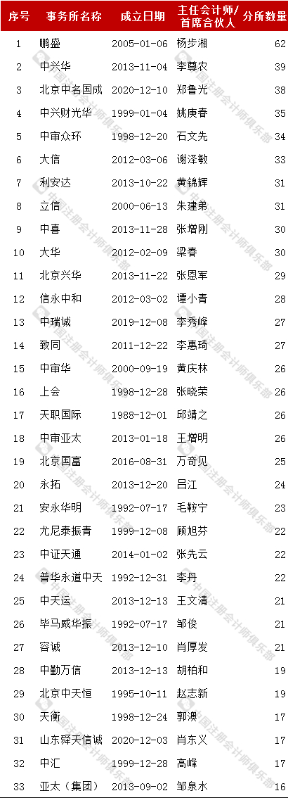 分所数超过15家的会计师事务所共有33家。具体排名情况如下: