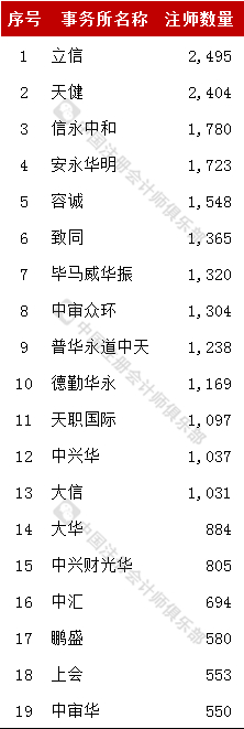注册会计师数量超500人的会计师事务所共有19家。具体排名情况如下: