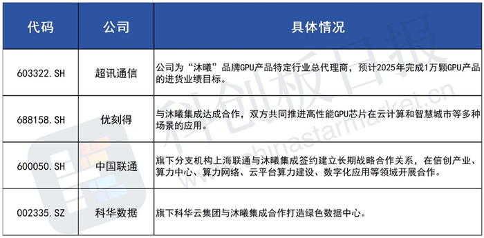 据《科创板日报》不完全统计,目前A股已有多家公司与沐曦达成合作: