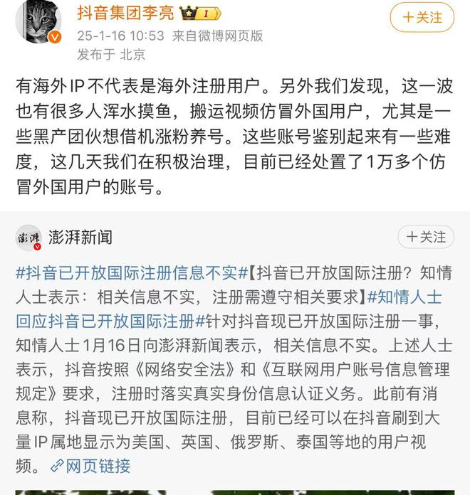 对此抖音副总裁李亮发文称有海外IP不代表是海外注册用户。他还表示发现这一波也有很多人浑水摸鱼,搬运视频仿冒外国用户,尤其是一些黑产团伙想借机涨粉养号。这些账号鉴别起来有一些难度,这几天抖音在积极治理,目前已经处置了1万多个仿冒外国用户的账号。