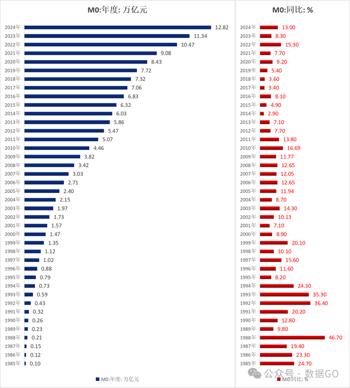 2024年,中国M0余额(流通中现金)12.82万亿元,比2023年增长1.48万亿元,增幅13%。现在支付手段可以说是很发达了,但是老百姓手里拿的纸币或者硬币依然大幅增长,不知何故。