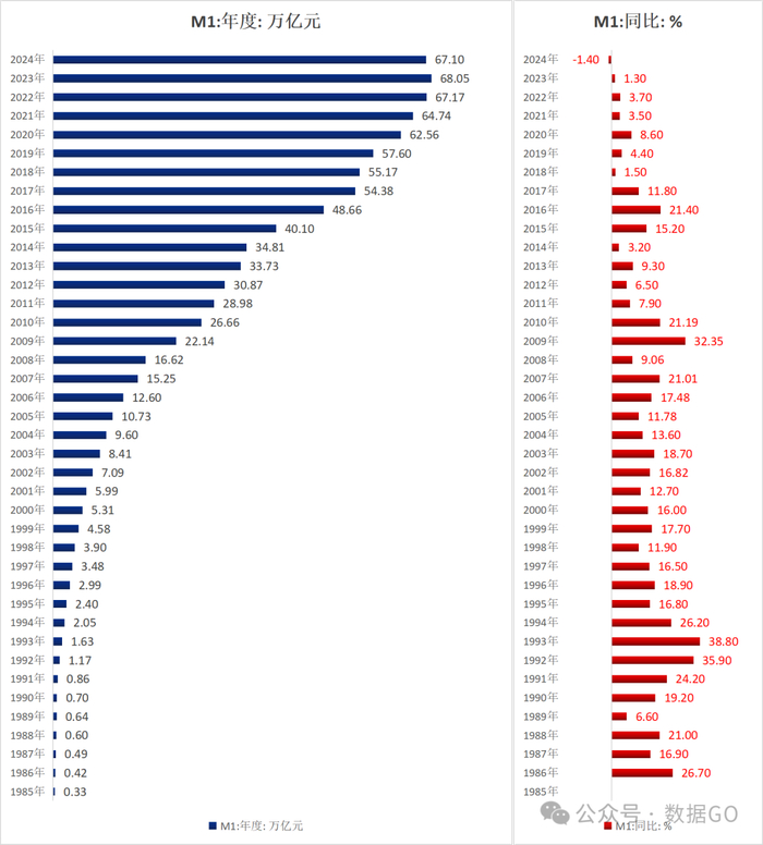 2024年,中国M1余额(狭义货币供应量)67.1万亿元,比2023年减少0.95万亿元,降幅1.4%。