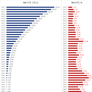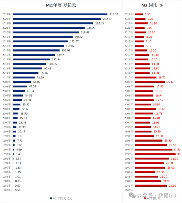 2024年,中国M2余额(广义货币供应量)313.53万亿元,比2023年增长21.26万亿元,增幅7.3%,首次突破300万亿元。1985年到2013年,用了约28年突破100万亿,然后用了7年到2020年突破200万亿,然后用了4年到2024年突破300万亿。