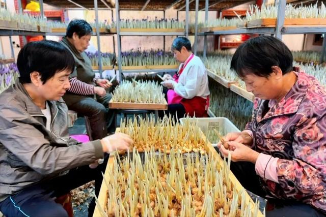 在安亭镇光明村村上小张农业合作社内,村民们分工合作,有的采摘花朵、剥离花丝,准备烘干;有的将采摘完的种球去除外衣,便于后期养护;有的则拔除侧芽,确保主芽营养。