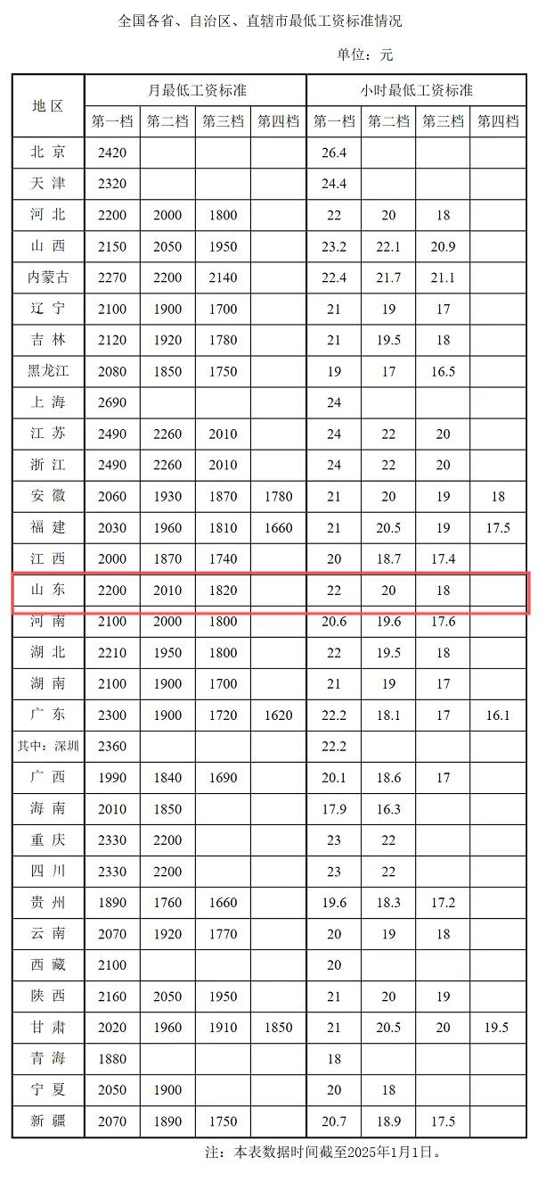 山东省第一档月最低工资标准为2200元,第一档小时最低工资标准为22元。