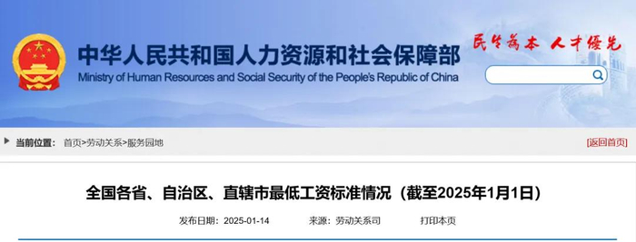 1月14日,人力资源和社会保障部网站发布《全国各省、自治区、直辖市最低工资标准情况(截至2025年1月1日)》。