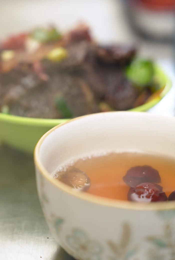 待到煎制环节,同样大有讲究。将猪油倒入烧热的平底煎锅,待油温升高,放入成型的猪臓,轻轻翻炒几下,随即加入一勺炖猪肉后浓郁醇厚的高汤,刹那间,香气四溢,仿佛能穿透灵魂。接着,放入切得细碎的葱头、鲜嫩的绿椒,再添上几片事先卤制得入味三分的猪头肉,短短几分钟,一道地道正宗的煎猪臓便可出锅装盘。此时,若是配上一杯本地酿造的土黄酒,那滋味,简直妙不可言!这土黄酒遵循中卫传统的土法酿造技艺,再加入适量冰糖、生姜精心调适口感,调节酒精度数。一口鲜香热乎的煎猪臓,一口酸爽开胃的土黄酒,酒的微酸巧妙地中和了猪头肉的油腻,让味蕾沉浸在一场完美的味觉盛宴之中,暖了胃,更醉了心。