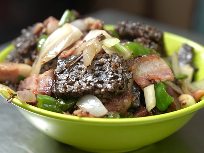 这备受追捧的煎猪臓究竟藏着怎样的故事?煎猪臓传承人高师傅给我们介绍了它的历史:“早在乾隆年间,我外祖父就是个杀猪卖肉的屠夫,整日与牲口、屠刀打交道。到了 1927 年,家里人合计着,怎么把猪血、猪下水这些平日里不起眼的边角料,变成让人馋涎欲滴的美味。先是把本地的糯米用凉水浸泡一整晚,隔天放到蒸屉里足足蒸上一个小时,至八成熟,趁着热气,迅速与新鲜猪血搅拌均匀,再撒上提味去腥的葱姜蒜粉,还有那神秘配方的秘制调料,接着二次上蒸笼,蒸制两小时后关火,让它在余温中自然焖上一个小时,最后压实成型,这才成就了最初的猪臓模样。