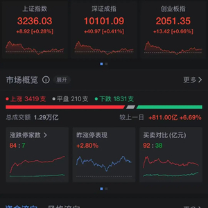 盘面上,热点快速轮动,个股涨多跌少,全市上涨个股3419只,涨停84只,下跌个股1831只,跌停7只。沪深两市全天成交额1.29万亿元,较上个交易日增量811亿元。