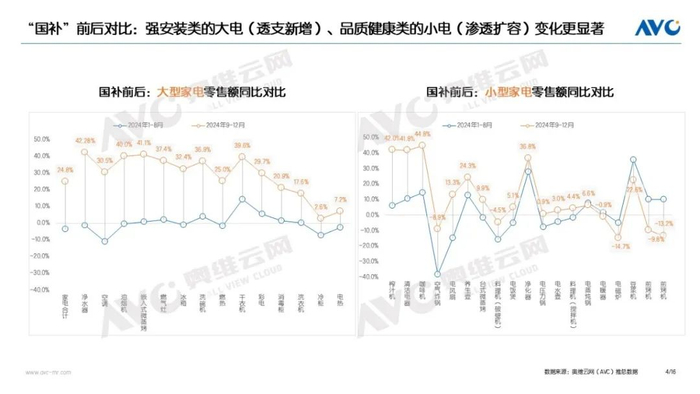 分品类看,奥维云网(AVC)推总数据显示,2024年仅厨小电和空调出现小幅下滑;从“国补”前后对比看,强安装属性的大家电以及品质健康类的小家电受益最明显。