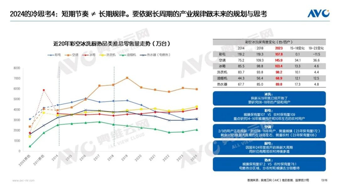 于远处做长期主义思考:“国补”会改变一些品类线原有的发展节奏,但是长期规律并不会改变,我们要依据长周期的产业规律做未来的规划与思考。比如冰洗,换新从2019年就已经开始了,要研究2008-2018年的产品和用户;彩电城镇保有量107、农村保有量109,要重点研究2014-2016年城镇用户和2010年左右的农村用户;空调2/3的用户正在换新,对应2008-2016年用户,侧重城镇(2023年保有量172),剩余1/3的换新大周期约在2028年左右,侧重农村(2023年保有量106);厨电因国补2024年提前开启换新大周期,同时仍有局部农村持续渗透;热水城镇保有量97.2、农村保有量78.1,电燃热分区域、分农村和城镇去分别看待。