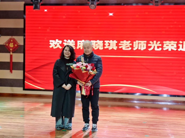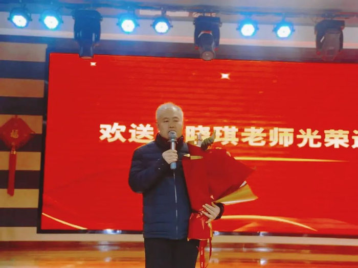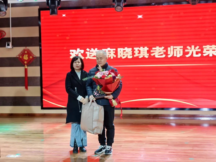 为了表达对退休教师的感激与敬意,大会第二项,全体教师为退休教师麻晓琪老师举行了欢送仪式。张副校长细数了麻老师认真工作的点滴,并为麻老师献上了鲜花;王校长表达了对麻老师三十年如一日奉献教育事业的感谢与崇敬之情,为麻老师送上了纪念品;项主任对麻老师表达了诚挚的祝福,希望麻老师退休生活愉快,为麻老师赠送了退休礼品。