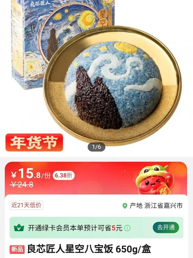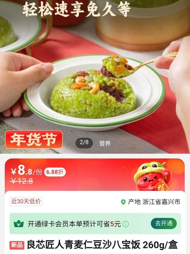 打开叮咚买菜APP或微信小程序,点击“年货大街”即可进入专区。针对上海人春节餐桌的必备美食,叮咚买菜自有品牌“良芯匠人”推出了多款“高颜值”的创意八宝饭。包括深受有娃家庭喜爱的“星空八宝饭”,犹如一幅星空图,精选东北糯米、云南紫米、东北大黄米等谷米原料,加上绵密的赤豆沙,好看好吃;另一热卖款“青麦仁豆沙八宝饭”,用青麦仁和麦苗汁染汁的东北糯米为主,表面添加丰富的坚果果仁,辅以细腻红豆沙馅,有料有颜,口感丰富。