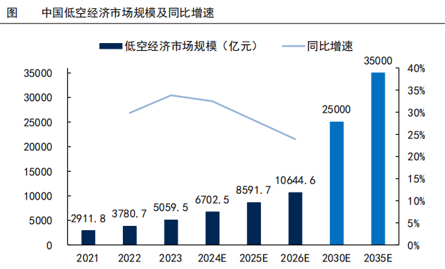 预计2024-2035年,国内低空经济市场规模将从0.67万亿增长至3.5万亿,市场规模相当庞大,这也将带动产业链上各个环节,实现业绩的稳健增长。