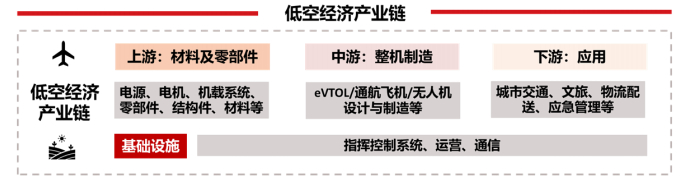 从整个低空经济产业链来看,上游主要是机载系统、电源等零部件,中游是eVTOL、无人机等整机制造环节,下游为交通、文旅、物流配送等不同的应用场景。