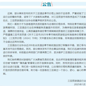 为维护春节期间旅游市场价格稳定,防止饭店客房价格异常波动,三亚市发展和改革委员会在2024年12月中旬就发布通知,称经市政府同意,决定对2025年春节期间旅游饭店标准客房价格实行政府指导价管理。