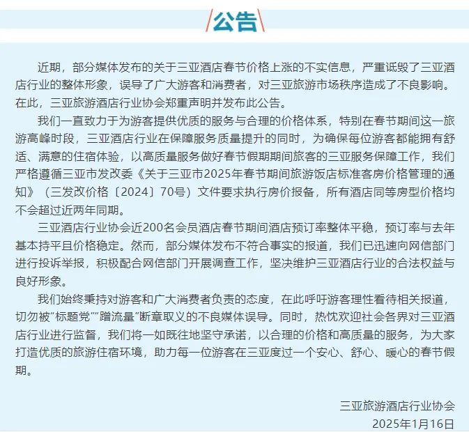 该声明强调,三亚酒店行业协会近200名会员酒店春节期间酒店预订率整体平稳,预订率与去年基本持平且价格稳定。关于相关不实报道,协会表示已迅速向网信部门投诉举报,并会积极配合开展调查工作。