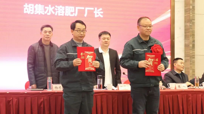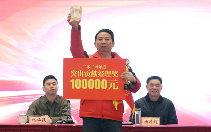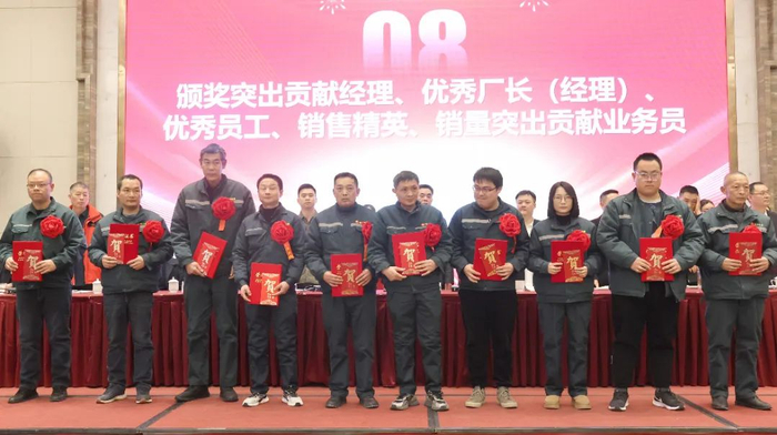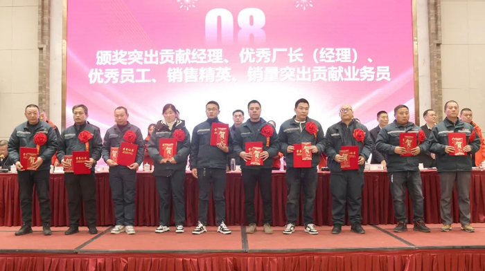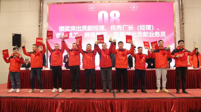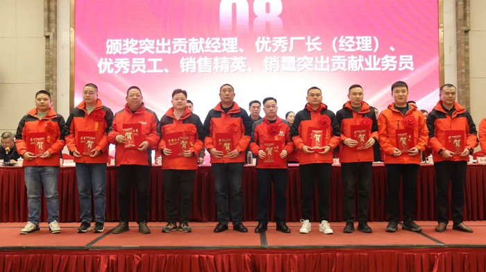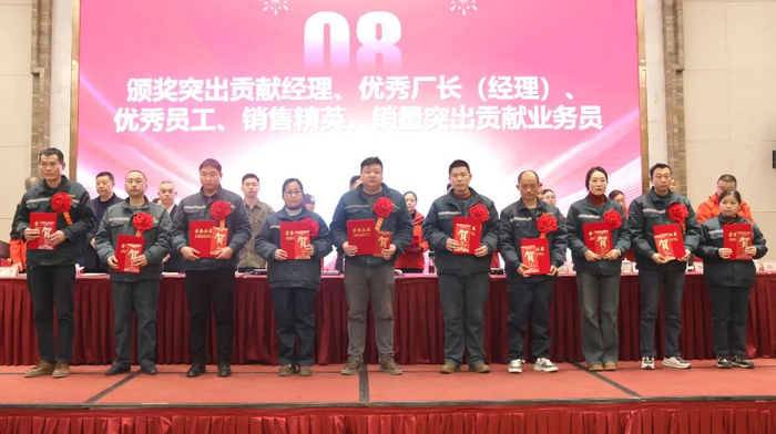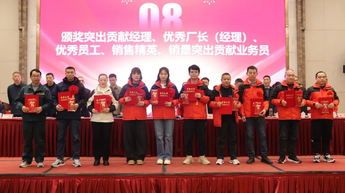 杨华登和鄂中生态副总经理杨华昆、鄢来裕、代中旭宣读了公司关于2024年度突出贡献经理、优秀厂长(经理)、优秀员工、销售精英、突出贡献业务员的表彰决定。黑龙江销售分公司经理罗文元被授予年度突出贡献经理称号,获奖金10万元。来自生产、销售、行管后勤、各分子公司的231名优秀干部员工佩戴红花,获颁证书、奖杯和奖金。