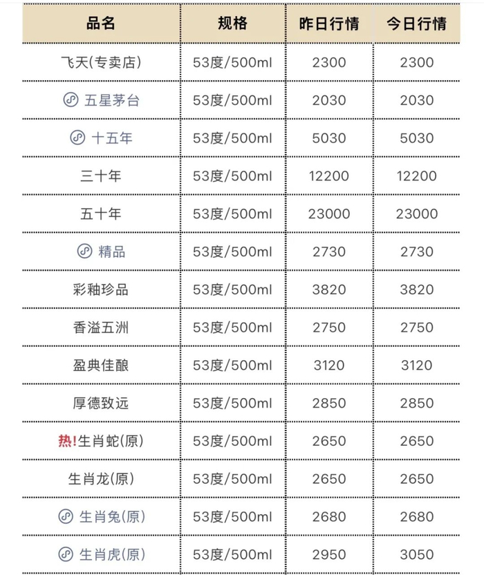 据今日酒价数据,马年生肖茅台、羊年生肖茅台、猴年生肖茅台、鸡年生肖茅台、狗年生肖茅台、猪年生肖茅台、鼠年生肖茅台、牛年生肖茅台、虎年生肖茅台、兔年生肖茅台、龙年生肖茅台批价分别为15500元/瓶、25200元/瓶、3800元/瓶、2950元/瓶、2900元/瓶、3150元/瓶、3000元/瓶、2900元/瓶、3050元/瓶、2680元/瓶、2650元/瓶。其中,据公开报道,马年生肖茅台、羊年生肖茅台、猴年生肖茅台、鸡年生肖茅台、狗年生肖茅台产量分别为350吨、250吨、650吨、800吨以及1500吨。