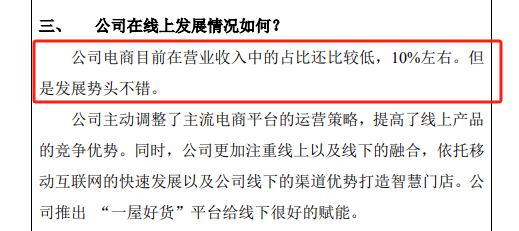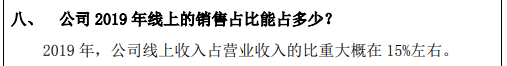 2019年,公司套件收入10.27亿元、同比增长7.54%;被芯8亿元、增长5.13%;枕芯1.59亿元、增长21.18%;其他6.17亿元、增长34%,四大产品板块均保持增长。虽非透露具体线上收入状况,但在当年4月一份投资者关系活动记录表中,公司表示“电商目前在营业收入中的占比还比较低,10%左右”,2020年5月又透露,“2019年线上收入比重大概在15%左右”。