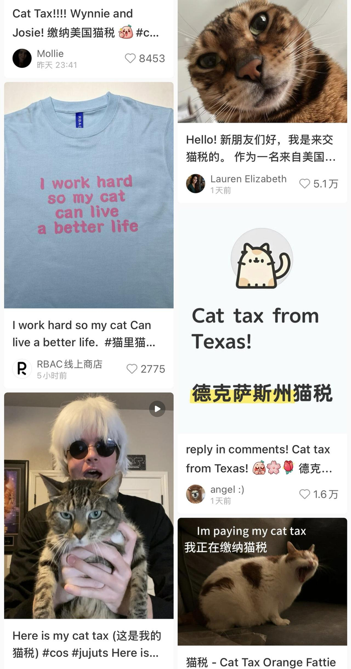 在小红书上欢乐聊天的中美网友们很快创造出不少热梗,比如“交猫税Cat Tax”“小红书的早A晚C”“小学生作业全球互助”等。