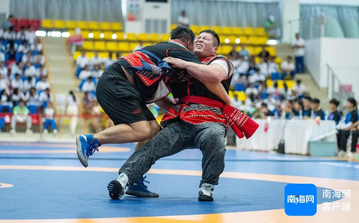 2024年11月23日,格(彝族式摔跤)87公斤以上级在进行比赛中,新疆生产建设兵团代表团(蓝)朱马拜·斯拉木对战海南代表团(红)巴图吉日嘎拉。南海网、南国都市报记者 刘孙谋 摄