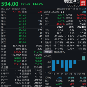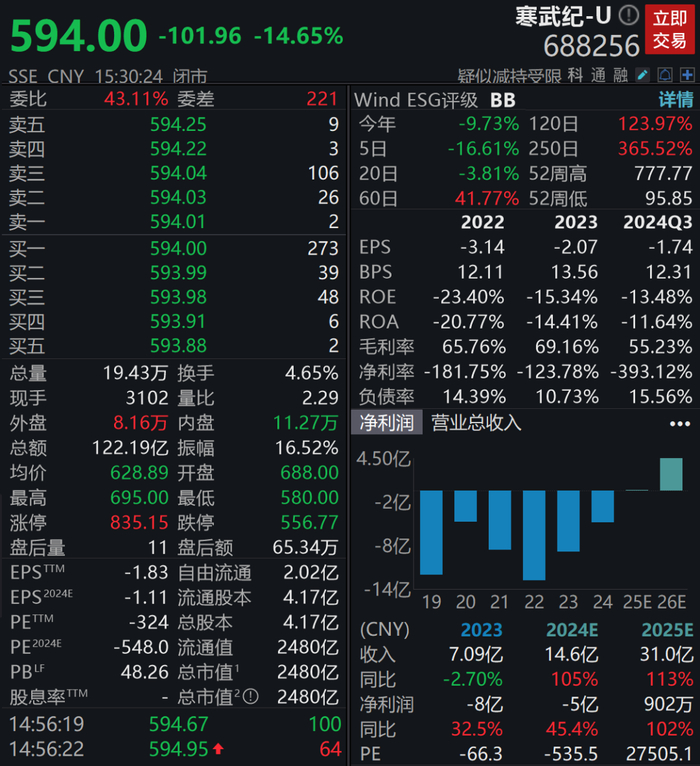 1月16日,寒武纪收盘下跌14.65%,股价失守600元大关,报收于594元/股,资金撤离的趋势明显。