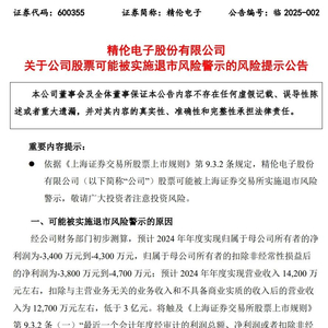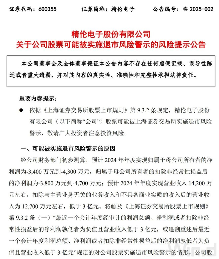 项乾消息:1月16日晚,精伦电子(600355.SH)发布公告称,预计公司2024年度净利润亏损,且营收低于3亿元,该事项触及上交所上市规则,可能将被实施退市风险警示,即在公司股票简称前加“*ST”。