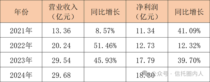 2024年,华鑫信托各项经营指标稳健增长,资本实力、抗风险能力持续增强,实现营业收入29.68亿元,利润总额24.16亿元,净利润18.3亿元,三项均创公司历史新高。