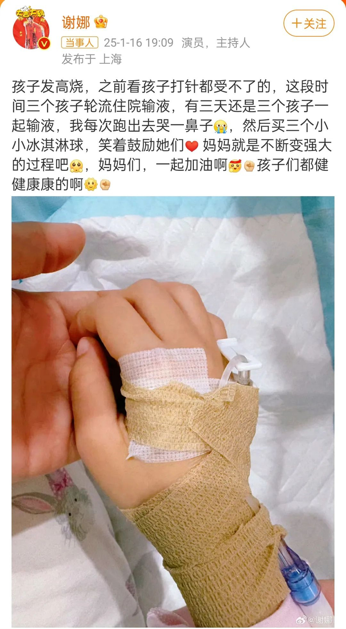 1月16日,谢娜发文称这段时间她的三个孩子轮流住院输液,有三天还是三个孩子一起输液,“我每次跑出去哭一鼻子,然后买三个小小冰淇淋球,笑着鼓励她们,妈妈就是不断变强大的过程吧,妈妈们,一起加油啊孩子们都健健康康的啊 ”。