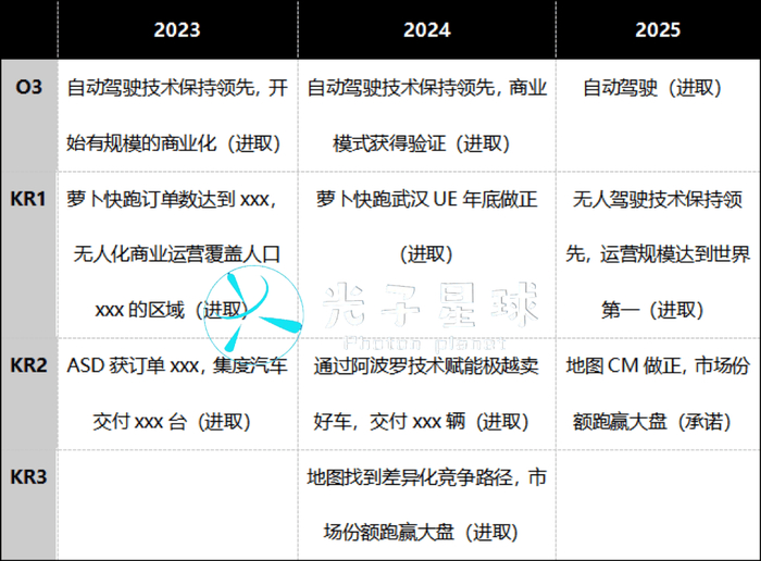 比如2024年O1对于移动生态的定调是“完成移动生态的AI原生化改造”,再往前一年是“跑赢大盘”。今年四个目标仅有名词与类型:O1移动生态(承诺型)、O2智能云(承诺型)、O3自动驾驶(进取型)、O4组织能力(承诺型)。