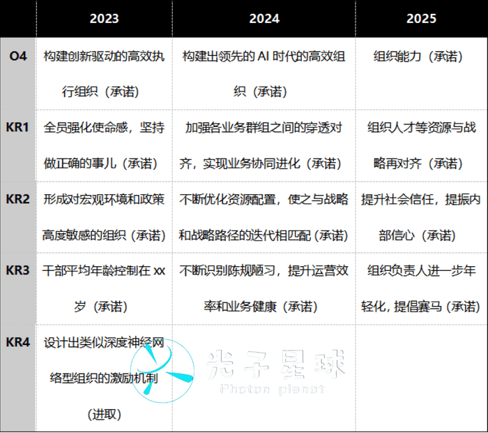 光子星球注意到,今年OKR的表述与去年有诸多值得对照之处,后文将对照分析。以第一个关键成果的表述为例,2024年的“保持增长”与2025年的“回正”,皆带有明显的“求稳”色彩。