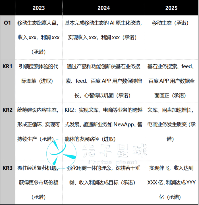 最明显的变化是目标不再有对应描述,四个目标仅有部门的描述,而没有给出具体方向。往年,李彦宏会给四个目标写一段定调的文字。