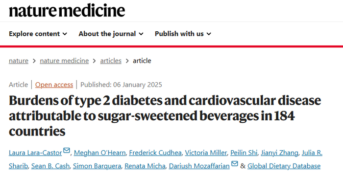 2025年1月6日,美国塔夫茨大学的研究人员在 Nature Medicine 期刊上发表了一篇题为 Burdens of type 2 diabetes and cardiovascular disease attributable to sugar-sweetened beverages in 184 countries 的研究论文。其中显示,2020年,含糖饮料消费造成了220万新发2型糖尿病病例,120万例新发心血管疾病病例,占所有新发病例的9.8%和3.1%。