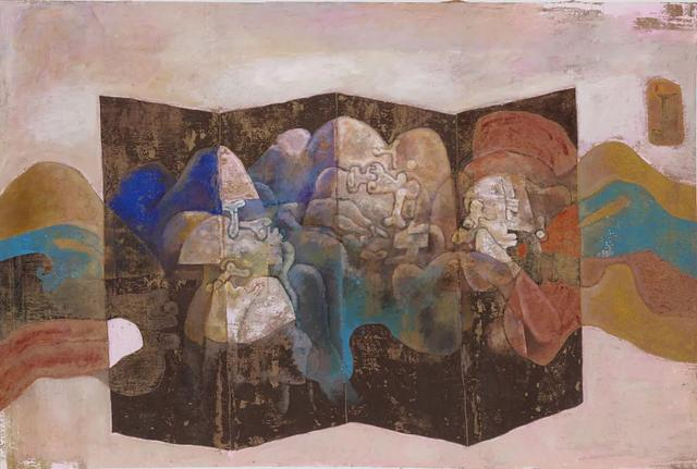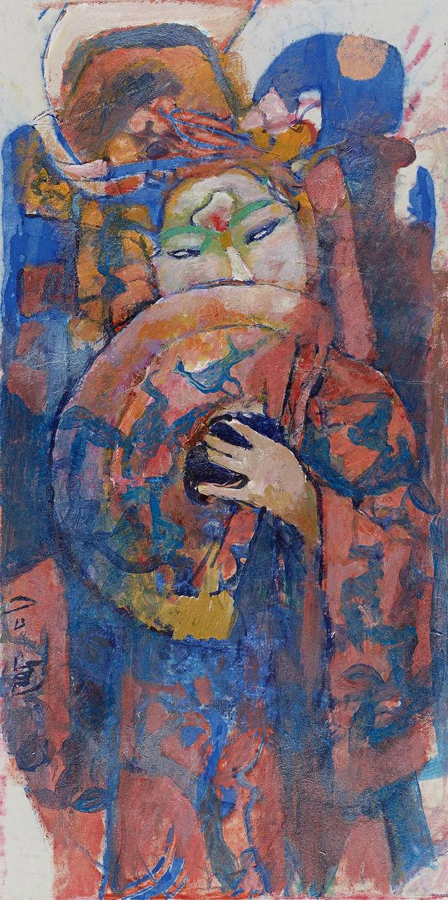 其重彩画作虽亦可作如斯理解,但似更加繁复,糅入更杂,更加注重表面的炫目之感。尤其是,在从非洲归来,复游历云南、西藏、甘肃、西域、南洋等诸地,立足于强悍的心性,一手探入远古的苍莽与悠远,一手探入民间艺术的丰华与厚重,复糅入西方现代艺术的语言和观念,予以消化融合,其作品乍看如青铜与古陶般的质感与奇幻,灿烂辉煌,注重呈现视觉表面的丰富与张力,然而若深入解析这一系列“错采镂金”之美的重彩之作,正如宗白华拈出来两种美学体系,其实与其水墨画作的简洁清新与“初发芙蓉”之美互为表里。