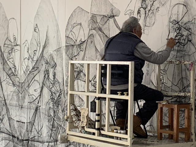 一只小白狗或前或后,紧紧跟随,标准的中华田园犬,眼神里满是憨厚与善意,石虎俯身逗弄了一下这狗,似乎说是捡来的,叫豆豆——然而豆豆很快跑开了,遂以豆豆为喻说起画中的线条,“比如说一根线条画下来,心灵中可能有一种愿望和必然性的结果,有一个预判,这是很正常的,可是画着画着不听你使唤了——像这宠物狗豆豆,你一叫它,反而跑了,跑了其实是一种天意,你要驾驭它跑,最后豆豆还能跟着你回家,这就是尊重线条的自在性,不然的话线条成为你的奴隶了。”