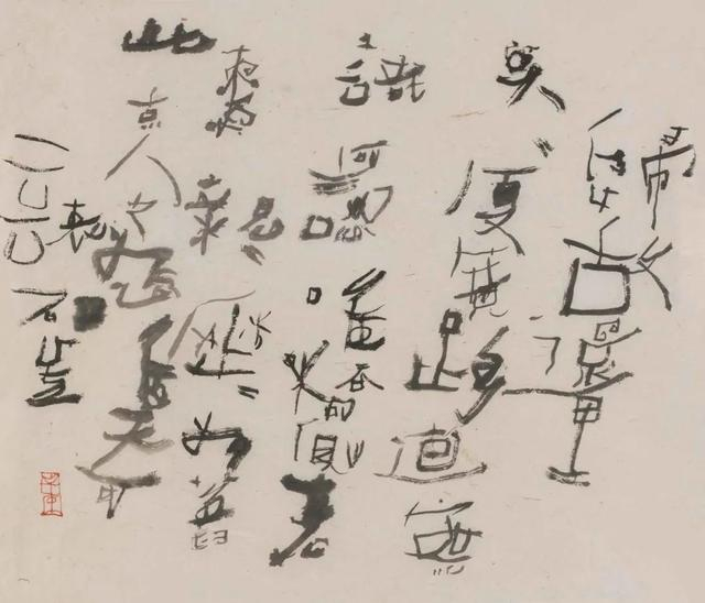汉字书法其实是中国艺术的基础,是故,石虎对汉字,对书法用力极深,且其书法之路迥异于常人,剑走偏锋进行造笔是一方面,另一方面更在于注重心性的追求,一些晚年书法乍看若画符一般,如刀砍斧削,极多干笔枯笔,颇难读懂,然而观之却别有野性与张狂之美,似若手之舞之,足之蹈之,见出自在。