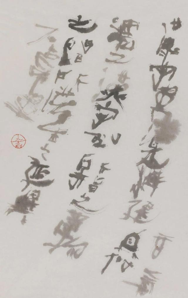 文字与书法的关系正在于书象而见心迹,因为借鉴史前岩画与古陶文,尤其是他书写自己的诗句,对原有汉字词重新组合,依稀的陌生感,而意义却可意会,从文本意蕴向视觉语言转换。以此书风书之,似乎扑面而来的是上古远古之风,率意恣肆而随心所欲的书写,然而本质上其实依然可以读出苦心经营处,让我想起汪曾祺写文章的说法“苦心经营的随便。”