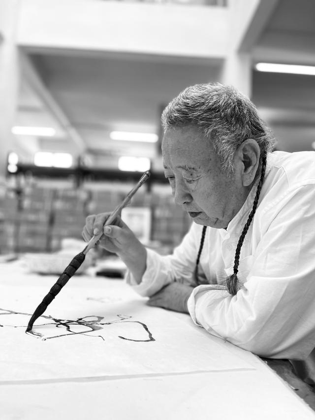 随后持长杆孔雀毛笔,于画案抽出一纸,镇纸压平,略一思索,中锋用笔,先画一轮,复缓缓逆笔,飘逸而出,顺势生发,各成笔画,成一“元”字,再上下并置,点出三点,最后以苍劲之笔书一“军”字,笔墨之间,苍浑,疏密,枯湿,浓淡,各尽其情 。他解释言:“写‘元浑’二字,这个字放在前面或者后面,来回颠倒,都行,比如三点水,把三点水不要看成是一个逻辑关系,三个点的并置,笔顺就是告诉你一个逻辑,这个逻辑是汉文化最讨厌的,汉文化不讲究逻辑。一笔顺下来之后有很多弊病,本来事物之间,其实最高的境界是无先后,读佛经就知道,是无界,无前后,什么都是无差别的。”
