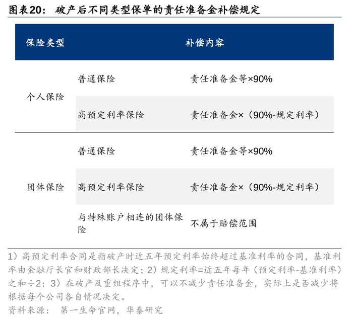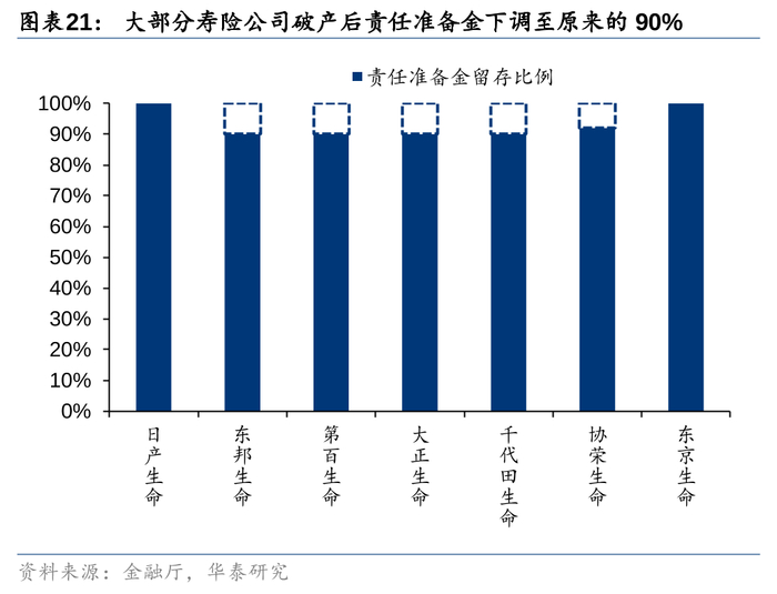 破产后责任准备金可适当下调,一般降至原有水平的90%。破产后,根据规定保单责任准备金可以适当下调。普通保险合同的准备金金额最低下降至原来的90%,对于高预定利率合同,准备金下降可能幅度更大。历史上破产的7家保险公司,大部分将责任准备金下降至原来的90%,日产生命和东京生命则维持准备金的水平为原水平不变。