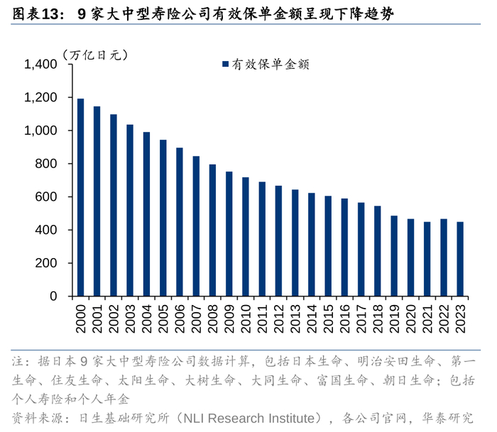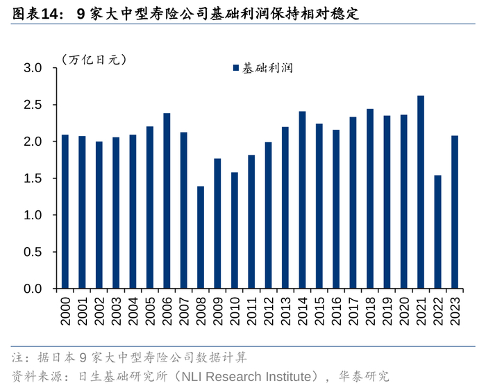 利差的增长支撑基础利润保持相对稳定。21世纪伴随着保单总规模的收缩,头部9家公司死差益和费差益之和呈现下降趋势,由2000年的3.41万亿日元下降75%至2023年的1.35万亿日元。2000-2023年,在日本寿险行业新单增长动力不足的背景下,头部9家大中型寿险公司的有效保单金额呈现下滑趋势,由1192万亿日元下降至448万亿日元,带动死差益和费差益下降。这种情况下,利差的增长成为利润提升的重要驱动力。基础利润是日本寿险业的重要利润指标,表征公司的基本盈利能力,可近似看成利差、死差、费差之和。在利差的有力支撑下,9家公司实现了基础利润的相对稳定。