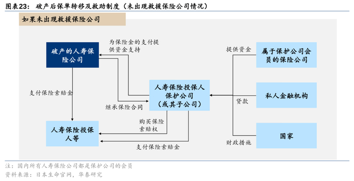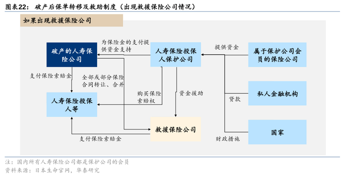 保险公司破产后,保单将被转移给其他金融机构。如果寿险公司破产,公司原有保单仍继续存在,将被转移给救援保险公司或人寿保险投保人保护公司设立的子公司(或保护公司本身)。1998年12月1日,日本根据保险业法规定,设立了人寿保险投保人保护公司,当寿险公司破产时,保护公司就会提供必要的资金支持,并且寻找救援保险公司(由其他寿险公司担任)承接破产公司原有合同。如果无法找到救援保险公司,则由保护公司子公司(或保护公司本身)接收破产公司保单。在保险合同完成转让之前,投保人不能取消保险合同,也必须继续缴纳保险费。