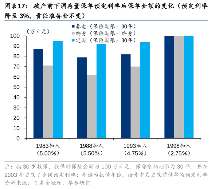 存量保单的客户利益调整分两个层面:第一层是降低存量保单未来的预定利率;第二层不仅调整未来的预定利率,对客户过往已经获得的利益也做出调整,做法是降低保单的责任准备金。日本寿险业的做法是,对于尚未破产但经营困难的公司,经过监管审批和投保人的协商,可以在一定幅度内下调预定利率,降低客户未来的收益。但不允许降低责任准备金,不允许调整过往的客户利益;对于已经破产的公司,则会同时降低预定利率和责任准备金,也就是同时降低了客户的未来利益和过往利益。1997~2001年破产的7家公司,预定利率普遍下降2~3pcts,多家公司存量责任准备金下调了10%。
