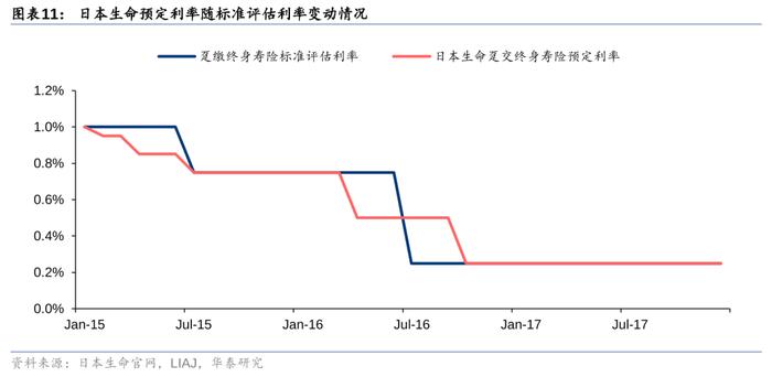 以日本生命为例,预定利率往往跟随标准评估利率变化。监管曾于2015年下调行业标准评估利率,2015年7月1日至2016年6月30日签订的趸交终身寿险,标准评估利率由之前的1.00%下降为0.75%。标准评估利率下调后,日本生命也下调预定利率,将终身寿险的预定利率由0.85%下降为0.75%。可以看到,日本生命的预定利率跟随标准评估利率进行调整,二者之间的偏差较小。但同时,二者并非完全一致,预定利率可能提前下调,可能延后下调。